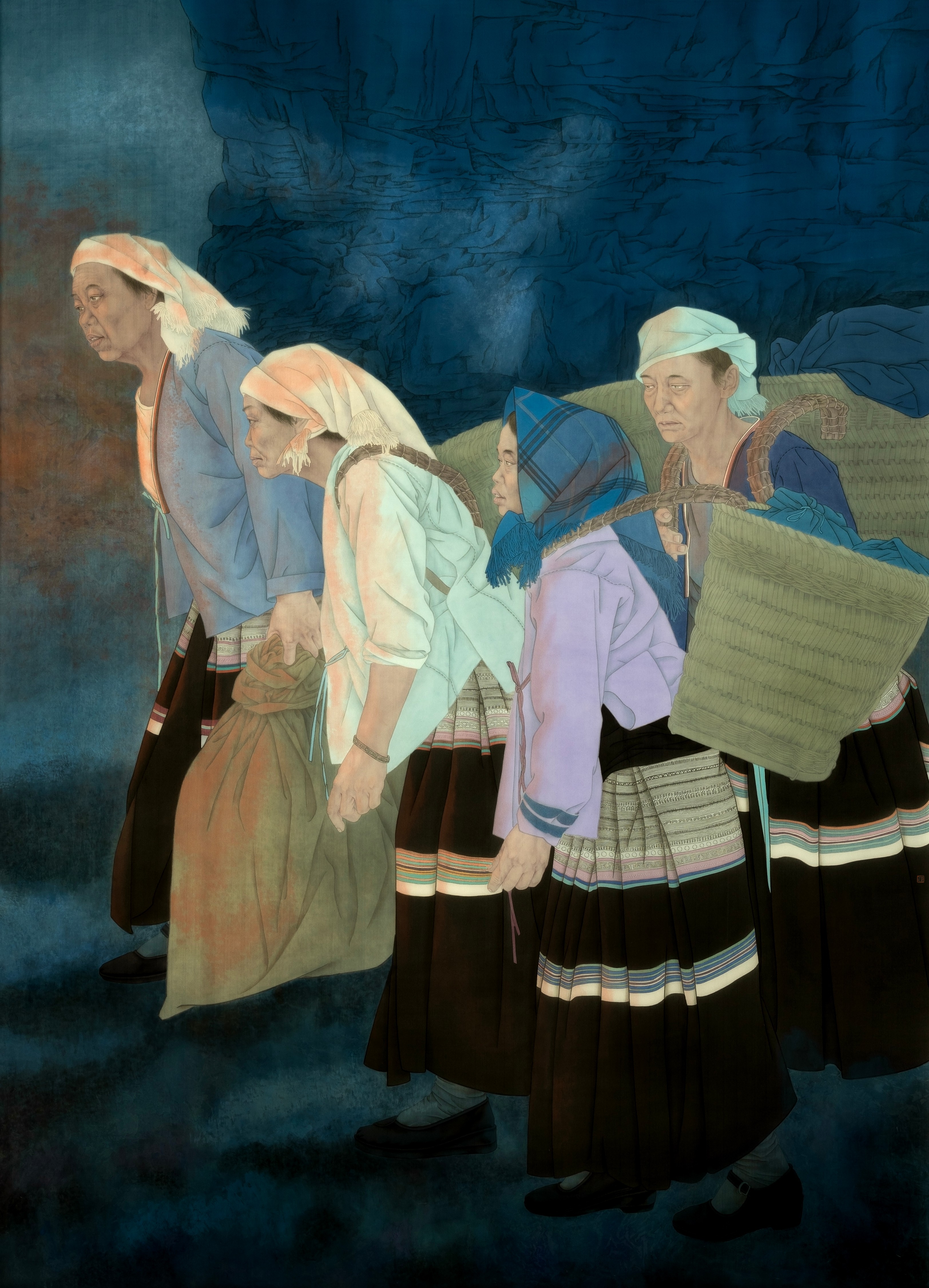 本作品以广西隆林德峨偏苗妇女赶圩场景为题材,作品以“劳动尊严”与“文化坚守”为双重主题,借队列式四位偏苗妇女形象暗喻文化传承,借助晨雾与朝晖的光影设计,将日常劳作升华为具有仪式感的文化隐喻。艺术表现上,创新采用未提炼靛青泥与矿物颜料混合的技法,探索传统染料的当代应用,营造斑驳厚重的岩彩肌理与历史纵深感,通过“在地性”材质创新与符号转译,以及光影的运用,为中国人物画注入现代语言。