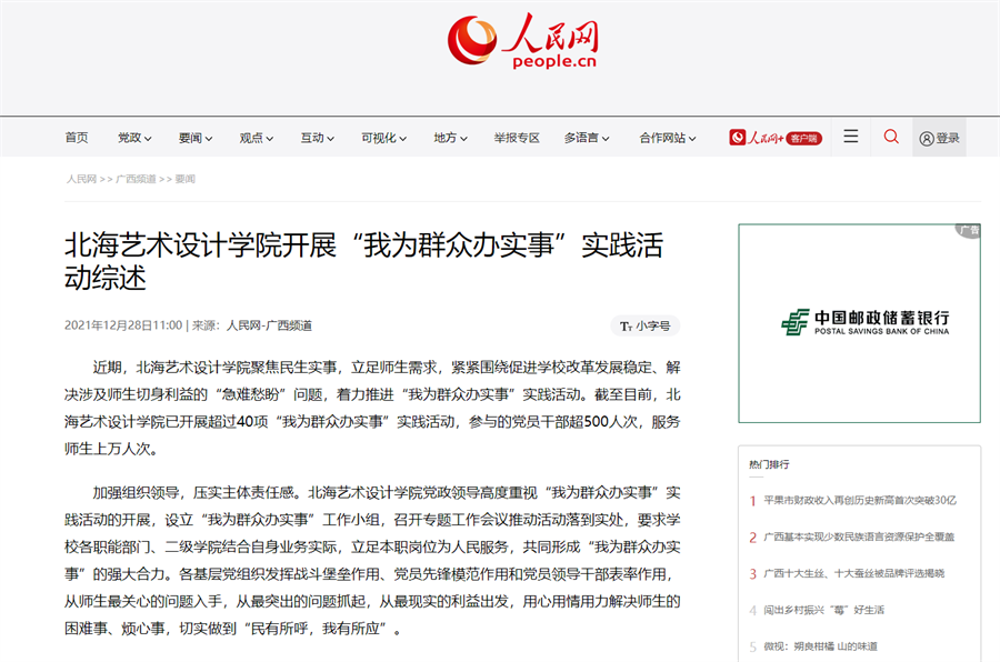 12月28日,人民网以《北海艺术设计学院开展“我为群众办实事”实践活动综述》为题,报道我校“我为群众办实事”系列实践活动。一直以来,我校不断关注民生实事,着力开展的相关实践活动已超过40项,参与的党员干部超500人次,服务师生上万人次。未来,学校将继续坚持从实际出发,切实把好事办实,把实事办好,办到师生群众的心坎上。
