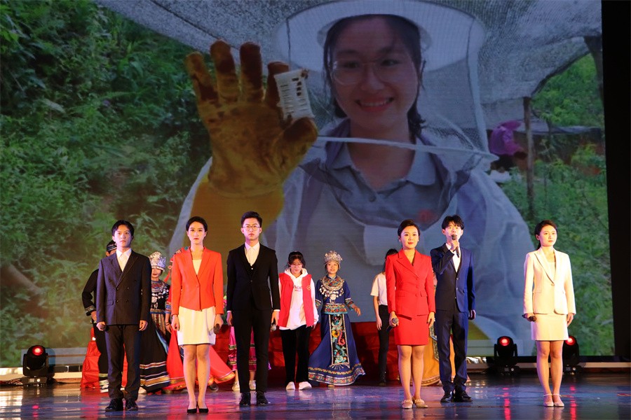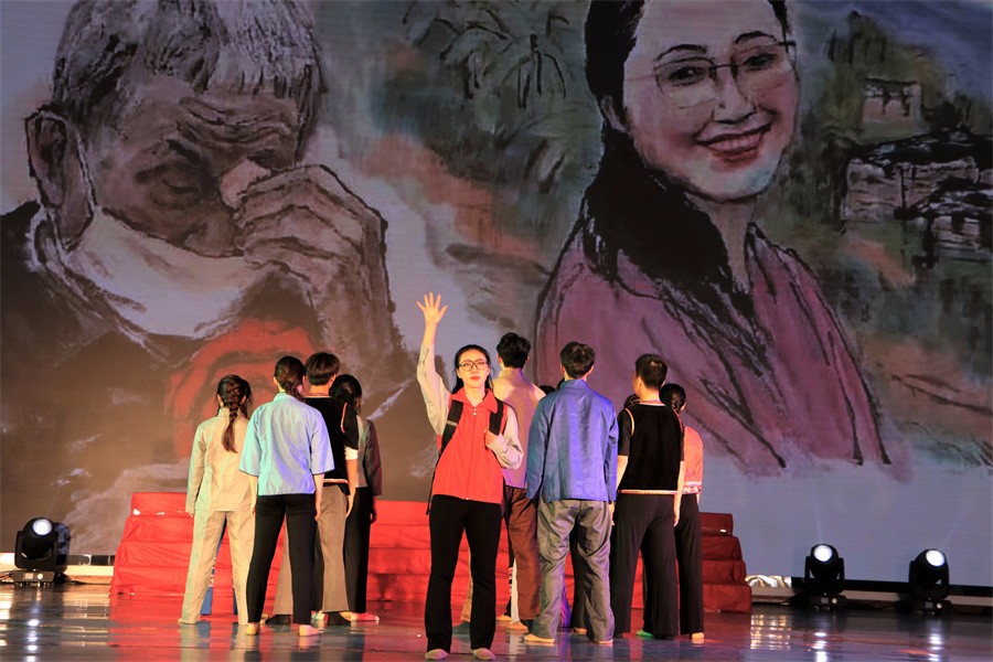 第三篇章“砥砺奋进新征程”,展示了党的十八大以来中国特色社会主义建设取得的伟大成就,以及党的二十大胜利召开具有的重大意义。《中国这十年》节目由马克思主义学院覃家惠教授结合党的二十大报告精神,生动展示了中国这十年取得的历史性成就和发生的历史性变革,使在场师生进一步增强民族自信心和自豪感,坚定实现中华民族伟大复兴中国梦的志气、骨气、底气。歌曲《领航》表达了师生们对中国共产党的深厚情感,对实现国家富强、民族振兴、人民幸福的坚定信心。集体诵读《请党放心强国有我》表达了北艺学子坚定理想信念,矢志拼搏奋斗,不断砥砺奋进的铿锵誓言。