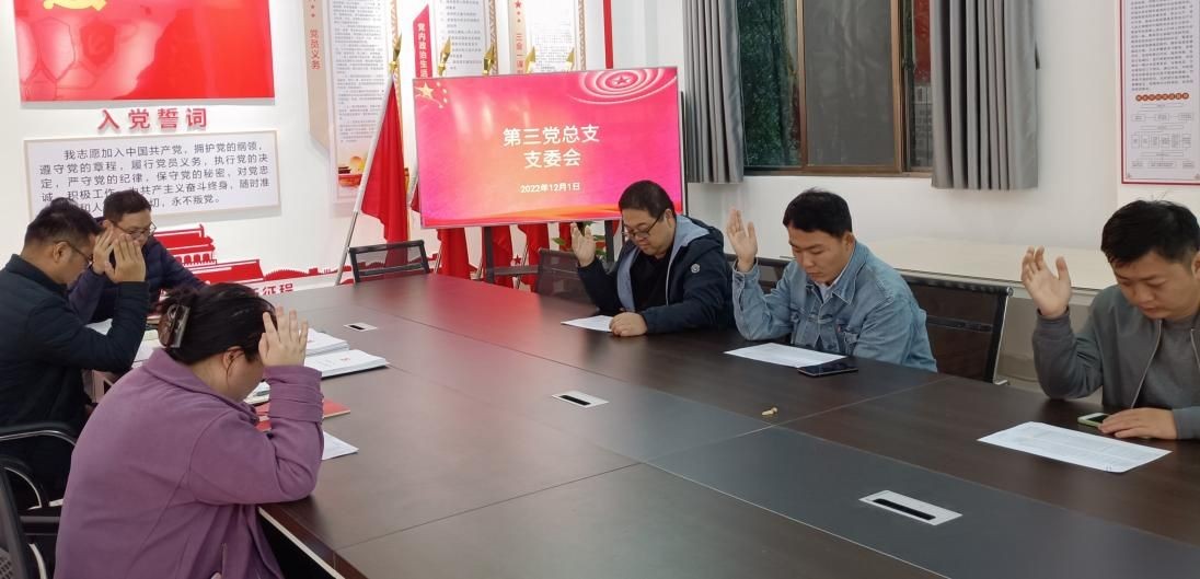2022年12月1日下午五点,第三党总支在综合楼102召开了讨论党员转正及审议预备党员会议,会议由党总支书记庞定坤主持,5名党总支委员参会。