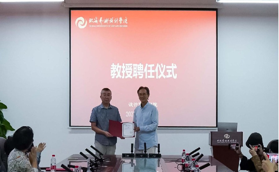 刘青林教授、刁梅教授作为受聘教授分别发言,刘青林教授对有机会参加北艺教学团队表示感谢,去年六月份刘教授就已接触到了部分北艺学生、老师,感受到了北艺老师学生们的敬业、认真的教学和学习态度。刘教授希望能在自己的任期内对学科建设、教学工作投入最大的热情,在北海艺术设计学院这所专业类院校发光发热。刁梅教授作为一位拥有丰富企业工作经验的教授,将会在未来的教学工作中探索课程与实践之路,为北艺培养社会适用的人才。
