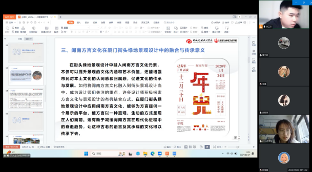 2024年11月21日至24日,建筑与环境艺术学院环境设计专业2025届本科毕业设计(论文)开题答辩在线上平台(钉钉会议和腾讯会议)顺利开展。本次开题答辩有2021级12个班级的516位学生参与。