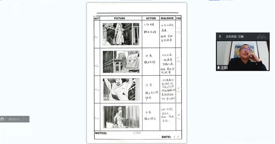 王钢教授分别通过名家、自身和学生的各类作品解析,多方位、全面地向大家展示不同的导演分镜头创作。他表示,在动画分镜头中,临摹各类大师创作的作品也是一种十分有效的方法,可以有效帮助大家对分镜头的学习和掌握。王钢教授还分享了各种分镜头创作脚本案例,分析脚本每个部分所蕴含的意义,内容简洁明了,逻辑清晰,带领在场师生更加快速准确地认识到分镜头台本的具体创作。