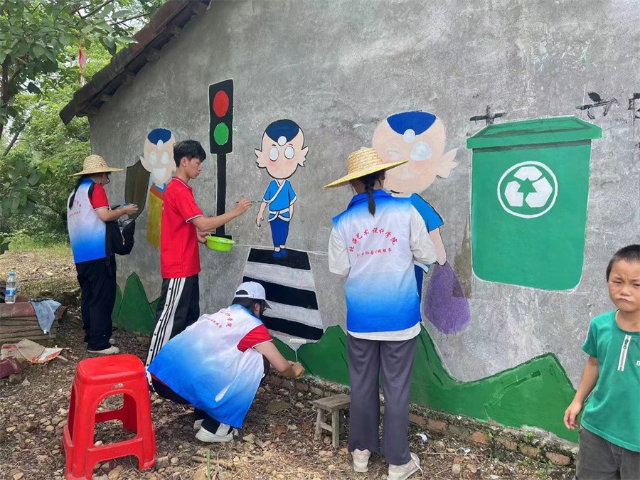 环境保护团前往红锦村小学以及乡村进行校园环境墙绘设计规划、乡村清洁等活动,帮助学校加强培育学风建设和校园人文环境,同时进一步改善校园以及乡村周边环境,积极为乡村学生营造更加温馨美好的学习、生活环境。