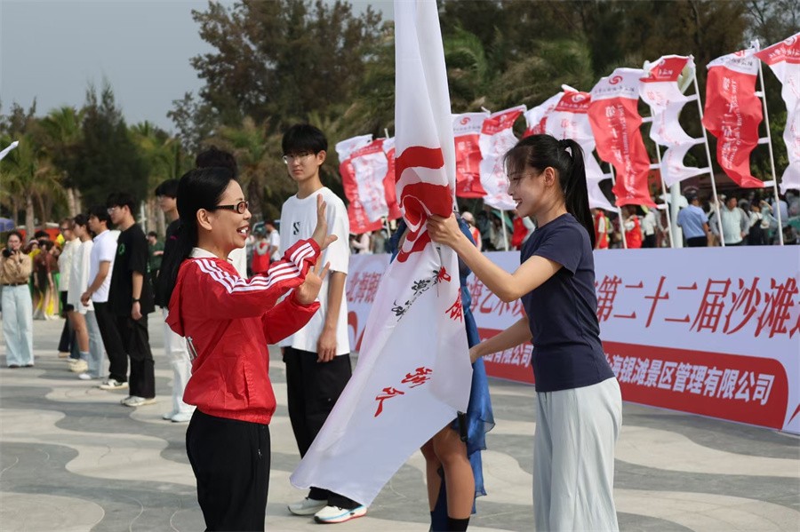 北海旅游集团副总经理李小军,学校常务副校长胡胜、副书记陈毅华为沙雕代表队授旗