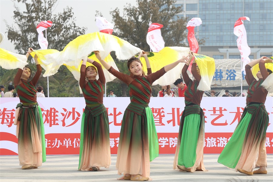 开幕式现场,精彩的文艺表演将现场气氛推向高潮,动感的舞姿、美妙的歌声、别具一格的服装走秀与蓝天白云、金色沙滩相映成趣,为运动会拉开了活力序幕,也让美丽的海滩焕发出了别样的光彩。