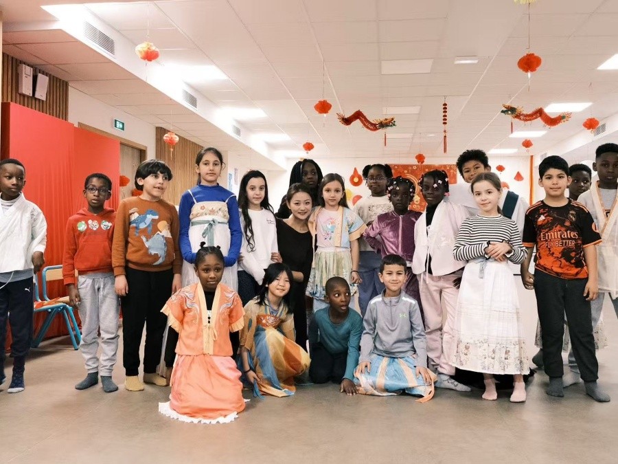 本次交流活动为期九天(2月18日至26日),覆盖当地青少年活动中心、市政广场、城市剧场等多个核心场所,形成多点联动、全域覆盖的文化传播格局。2月18日,我校团队率先走进玛丽-克洛德-瓦朗坦小学休闲中心、朱尔-费里小学休闲中心以及小格罗莱农场小学休闲中心三大青少年活动中心,开设非遗簪花制作、陶艺动物塑形、植物染扎染、篆刻艺术、传统手工葫芦工艺等中国非遗文化体验课程,同步开展中国古典舞教学与传统服饰文化展示体验活动。现场互动热烈,法国青少年与市民通过亲手实践,近距离感受中国传统手工艺的精湛技艺与文化内涵,有效激发了对东方文明的探索热情。