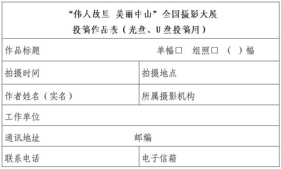 投稿作品以光盘(CD—R或DVD—R)、U盘存储形式邮寄至:北京市东城区东四十二条48号 中国摄影报社活动项目部首届中国·中山郑景康影像双年展:“伟人故里 美丽中山”全国摄影大展办公室收(100007)投稿热线:010—65251661。