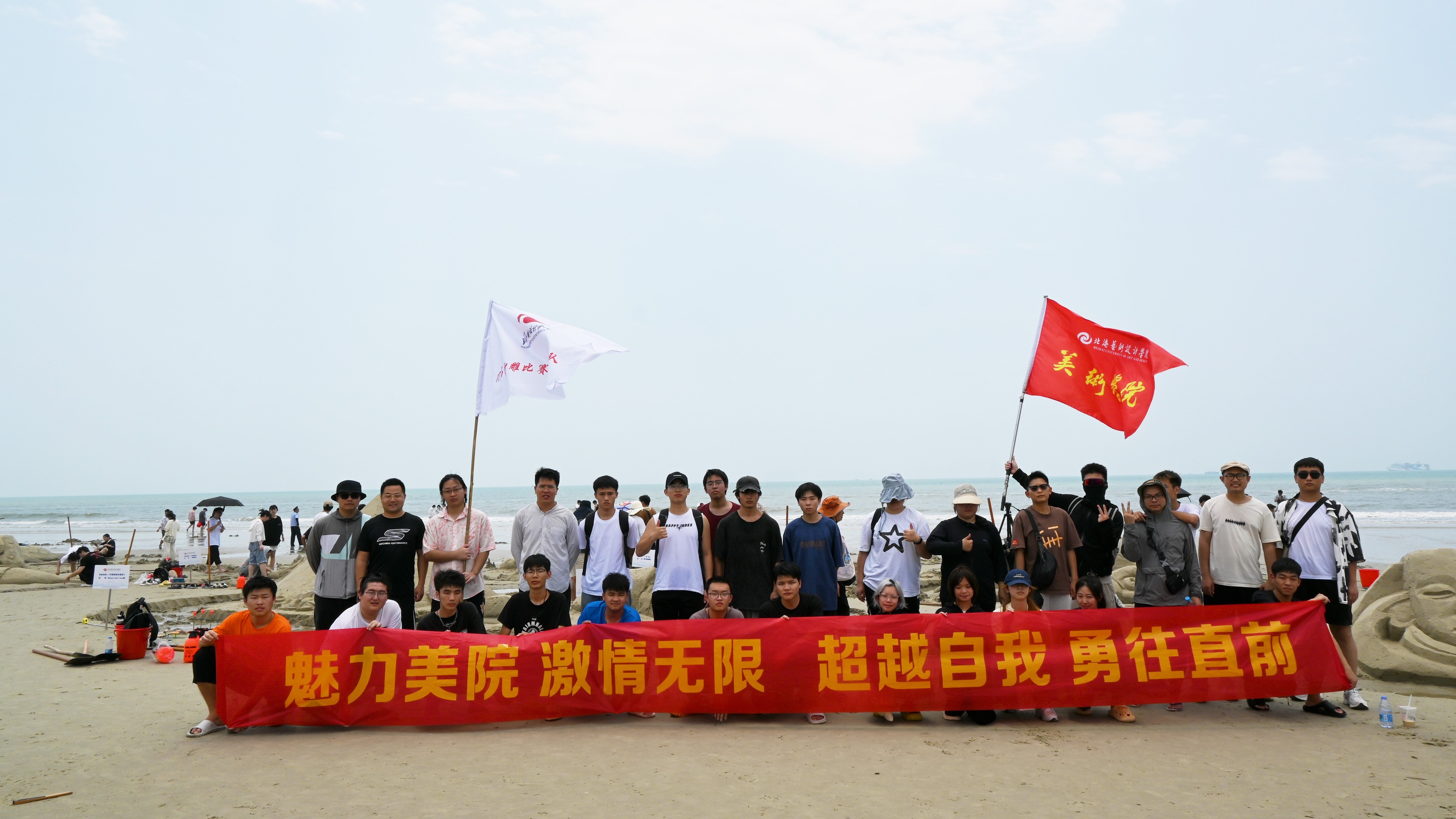 活动过程中,美院师生通力合作,在银滩风景区共同完成了一件又一件的精美沙雕作品,用不同的角度展现海洋文化,也在运动项目中共同鼓劲加油、挥洒汗水,进一步增强班级凝聚力。最终在沙滩雕塑中斩获一等奖一名、二等奖一名和优秀奖若干,也在沙滩排球项目中获得团体第二的好成绩。(李伟民,陈颖诗 摄)