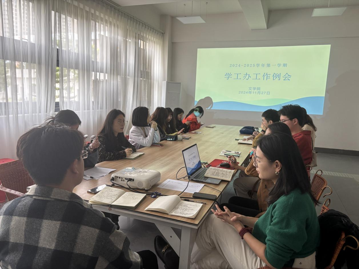 为进一步加强辅导员队伍建设,夯实学生工作基础,切实提升工作成效,我院于11月27日在南校区体育馆105会议室召开文学院学工办工作例会。学院党支部书记岳莹,学工副院长裴景旺、学工办主任陈文斌、学工办副主任韦帆、各年级辅导员以及各班级辅导员参与本次会议,会议由学工办主任陈文斌主持。