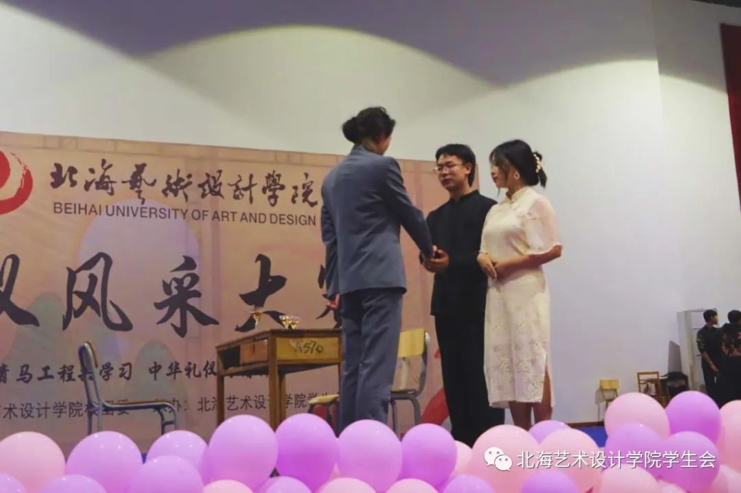 每队表演结束后评委老师进行打分,分数统计到计分人员处,给出准确及时的结果再反馈给主持人现场公布比赛分数。最后就是由评委老师给获奖队伍颁发证书并合照。由学生社团管理部表演的《现代婚礼》,获得第一名。“鹤归来兮,东山之阴。其下有人兮,黄冠草屦,葛衣而鼓琴。躬耕而食兮,其馀以汝饱。归来归来兮,西山不可以久留。”中国有服饰之美,故称华;有礼仪之大,故称夏。礼仪之魂不息,它必将被千千万万华夏子孙世代传承。(罗佳/摄)