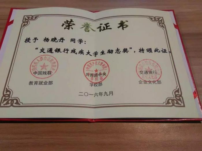 杨晓丹同学为我们树立了一个大学生的榜样,希望大家面临挫折时,能想起这个坚强的女孩,都能像她一样,不畏挫折,把握自己,主宰命运,蜕变成蝶!