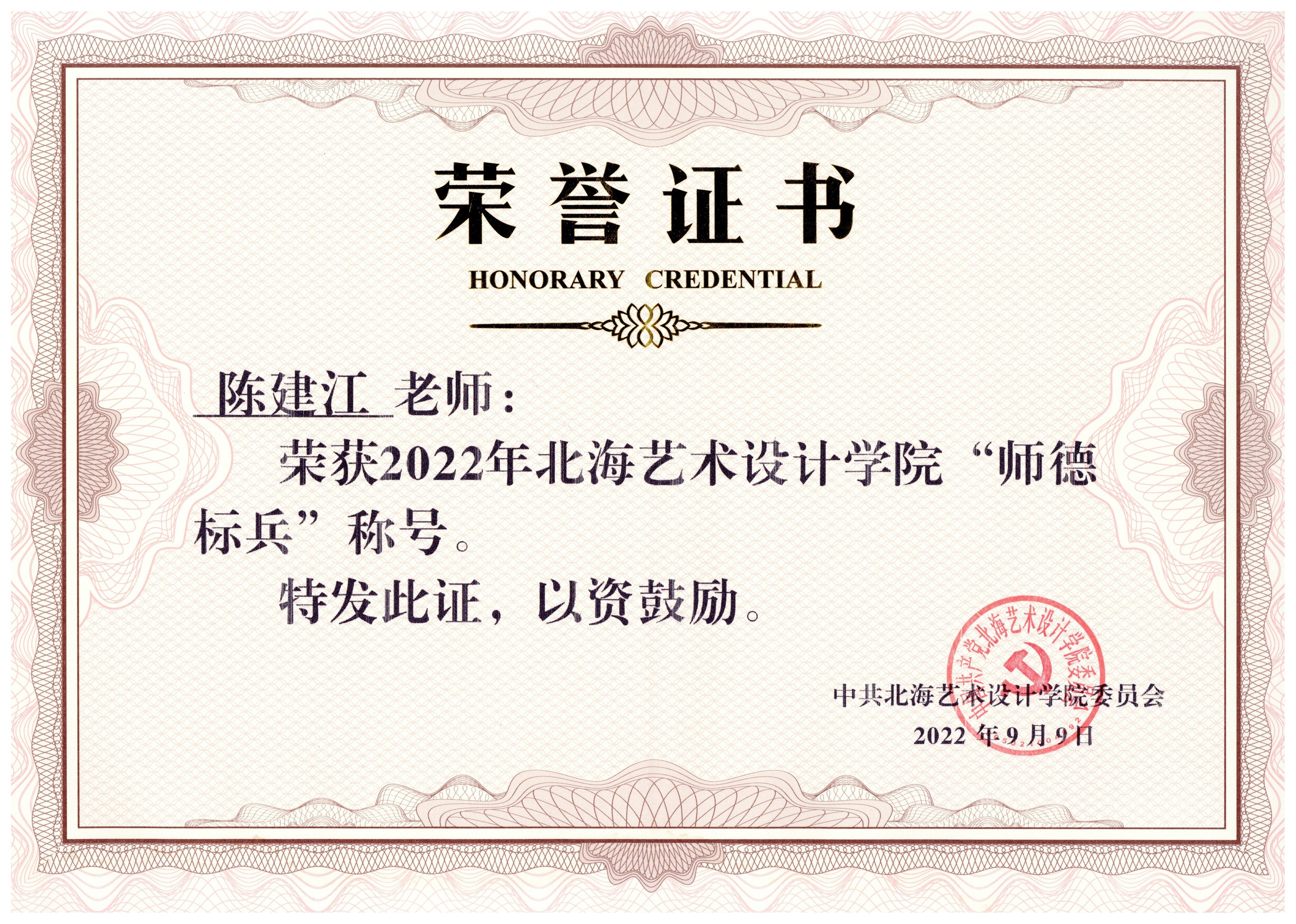 科研反哺教学,教书是为育人,精心方有成效。踏实的教学态度,经年累月的沉淀,最终将立德树人、为国育才的理念灌输到教学实践的点滴中去。培养出了一批批茁壮成长起来的优秀大学生,陈建江老师也获得了相应的荣誉。2022年,被评为北海艺术设计学院“师德标兵”称号;参加北海艺术设计学院教师教学创新大赛,荣获优秀奖。这些年,指导学生多次参加各类专业作品展览并获奖,如指导学生钟文竹参加由自治区农业农村厅举办的2021年第三届“广西稻渔丰收节”稻渔艺术作品比赛中荣获三等奖;2022年,指导学生林佳婕参加广西美术家协会举办的第二届广西工笔画作品展入选,荣获优秀奖;2021年,指导学生霍远琴创作的作品《守护·憩》,入围由中国美术家协会举办的“新征程奋进粤港澳大湾区全国中国画、油画展”。