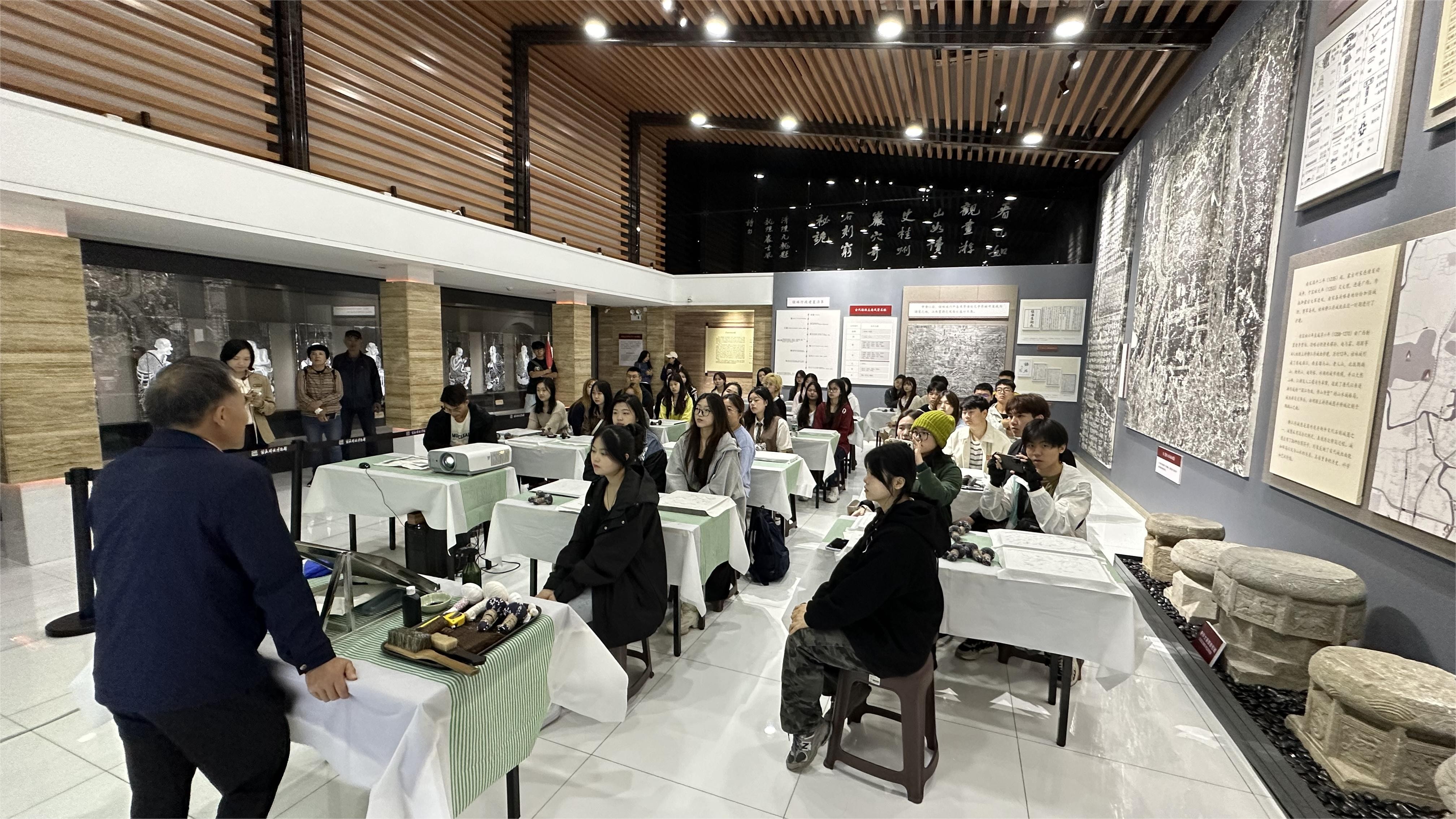 本次采风以桂海碑林博物馆的石刻艺术考察展开,在龙隐岩与阳朔山水园的参观中,同学们近距离接触碑刻摩崖艺术,体会唐宋摩崖的艺术魅力。陡峭山崖石壁上风格多样、形态各异的石刻书法作品深深吸引了同学们的目光。与此同时,非遗传承人韦老师带领同学们亲自体验中国碑拓艺术,了解造纸术,欣赏玉石文物,在欣赏山水风光、书法石刻作品的同时,对同学们艺术思维的延伸与审美多样化的拓展具有重要的影响作用。