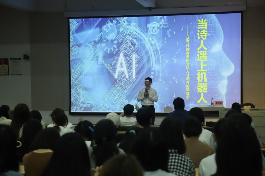 为提高学生文学阅读兴趣、扩宽学生知识视野,培养学生勤学求新意识,4月27日晚,湖南大学文学院谭军武副教授应邀为生做了一场题为“当诗人遇上机器人——从写作教育看新文科人才培养的新理念”的讲座。本次讲座旨在探讨人工智能与诗歌创作之间的关系,引起了学生们的广泛关注。人文教育学院全体师生参加了本次讲座,讲座由梁镨文副院长主持。