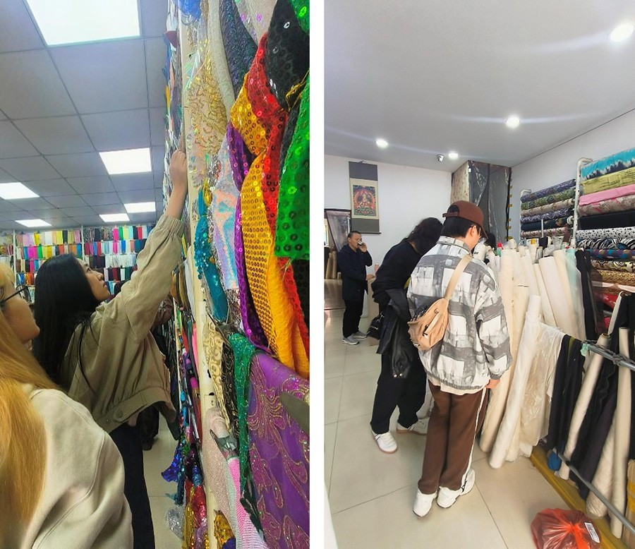 首先由毕业设计指导老师带队前往鑫海商贸城、云裳服饰广场等地开展学习调研,接下来指导学生在园区内进行毕业设计面料的选购、定制。在过程中注意引导学生结合自己服装毕业设计风格进行考察与记录,将所想落实,所见化真,鼓励学生将专业知识与创新实践相结合。