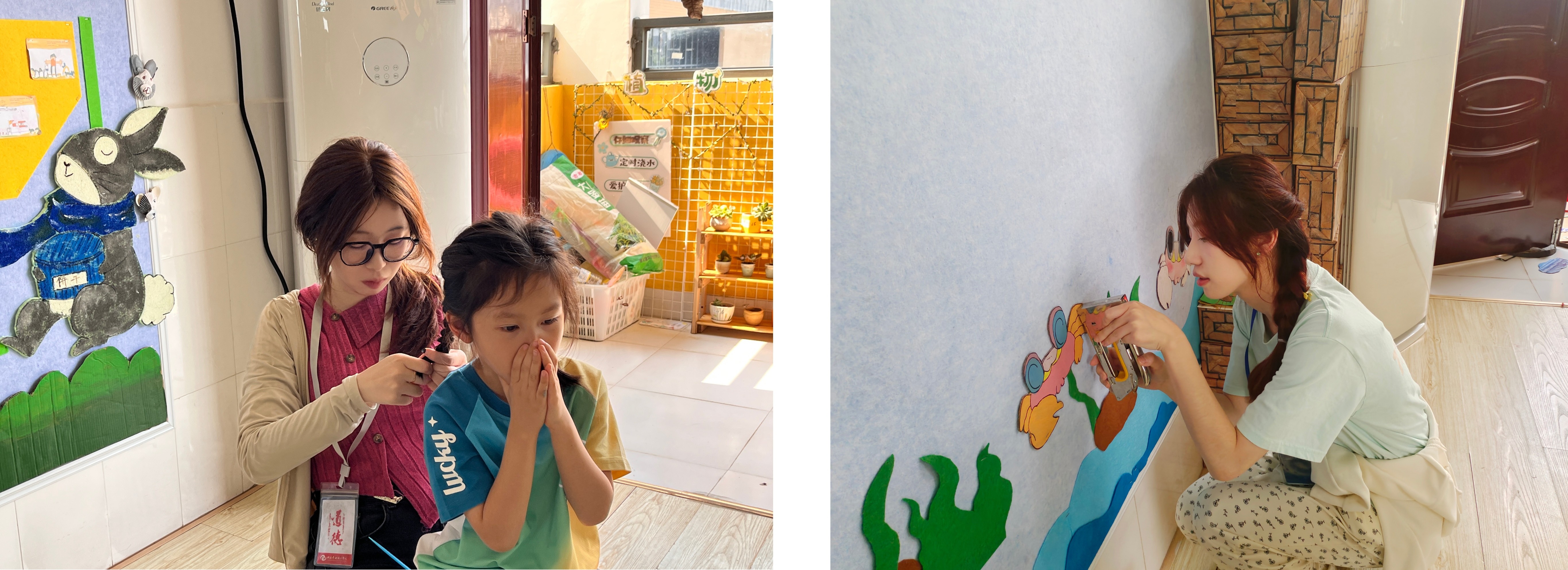 学前2301班陈楚翌帮幼儿扎头发 学前2301班郑小熠参与幼儿园环创