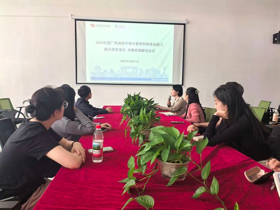 此次会议内容充实,为我院教师顺利开展2026年度广西中青年教师科研项目申报奠定了良好的基础。学院将以此次项目申报为契机,持续加强科研组织与服务工作,营造良好学术生态,助力学校科研工作高质量发展。(沈怡雯/摄)