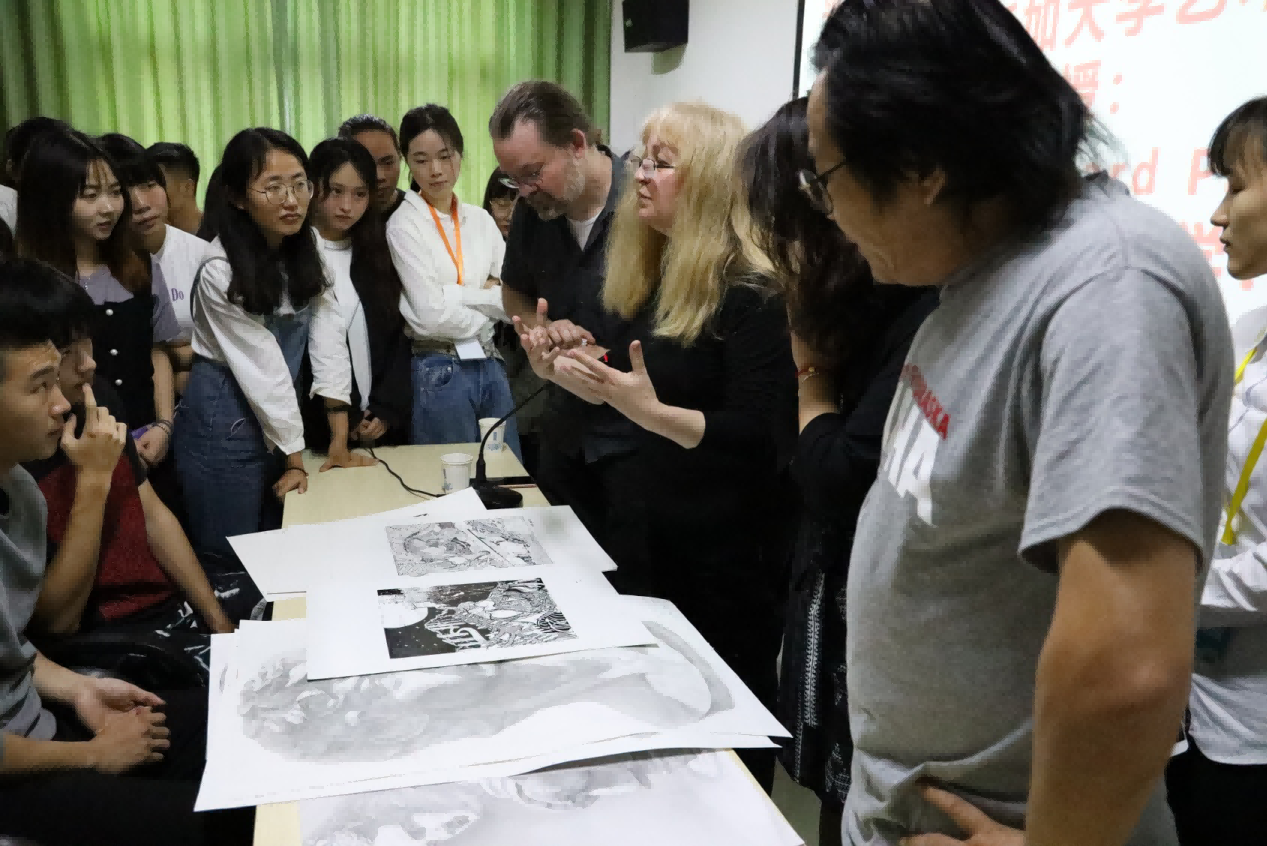 最后,学生们拿出平时最优秀的作品请艺术家与教授观看及指导。艺术家们对每位同学的作品都细心指导点评。针对学生作品中的不足予以指出,对于优秀的地方则鼓励其继续进行的提升。