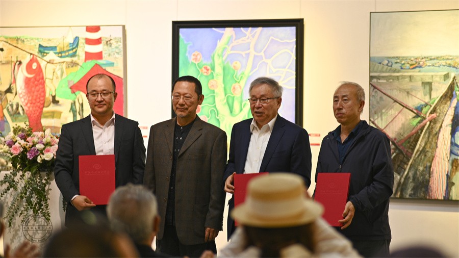 活动现场,李庚院长宣布展览正式开幕。美术学院刘斌院长代表学校向李可染画院的三位专家学者颁发“名誉教授”证书。