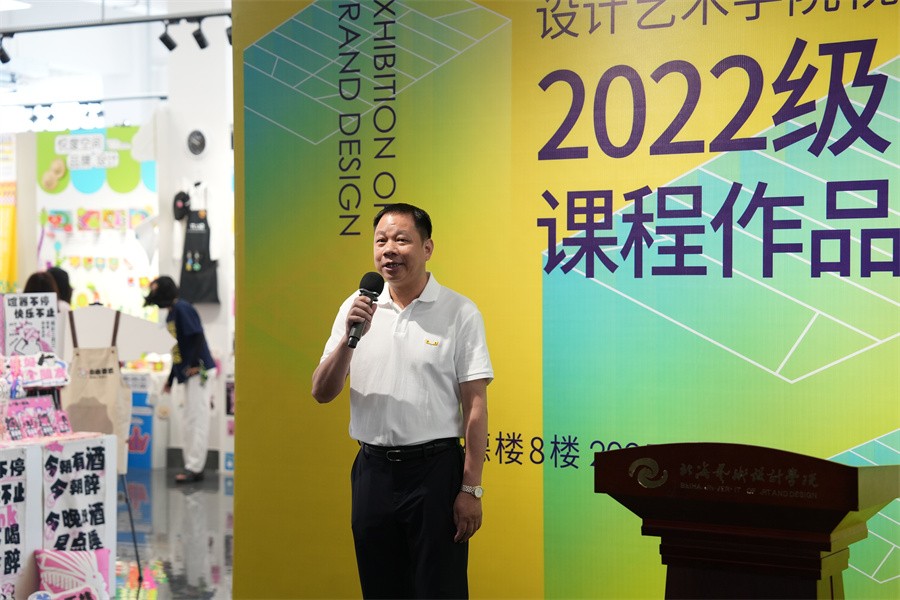 学校党委书记覃宪儒宣布“设计艺术学院2022级品牌设计课程作品展”正式开幕