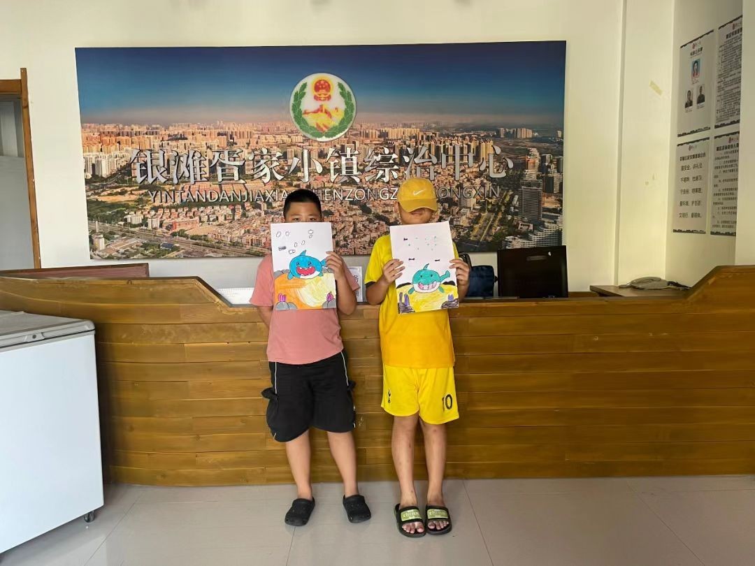 到了疍家小镇,“我们今天的主题是海底的小鲨鱼!”,小朋友们非常兴奋,志愿者们为他们讲述细节,修改色彩运用。不一会,一幅充满自然气息的绘画就完成了。小朋友们举起自己的画在镜头留下了满足的笑容。