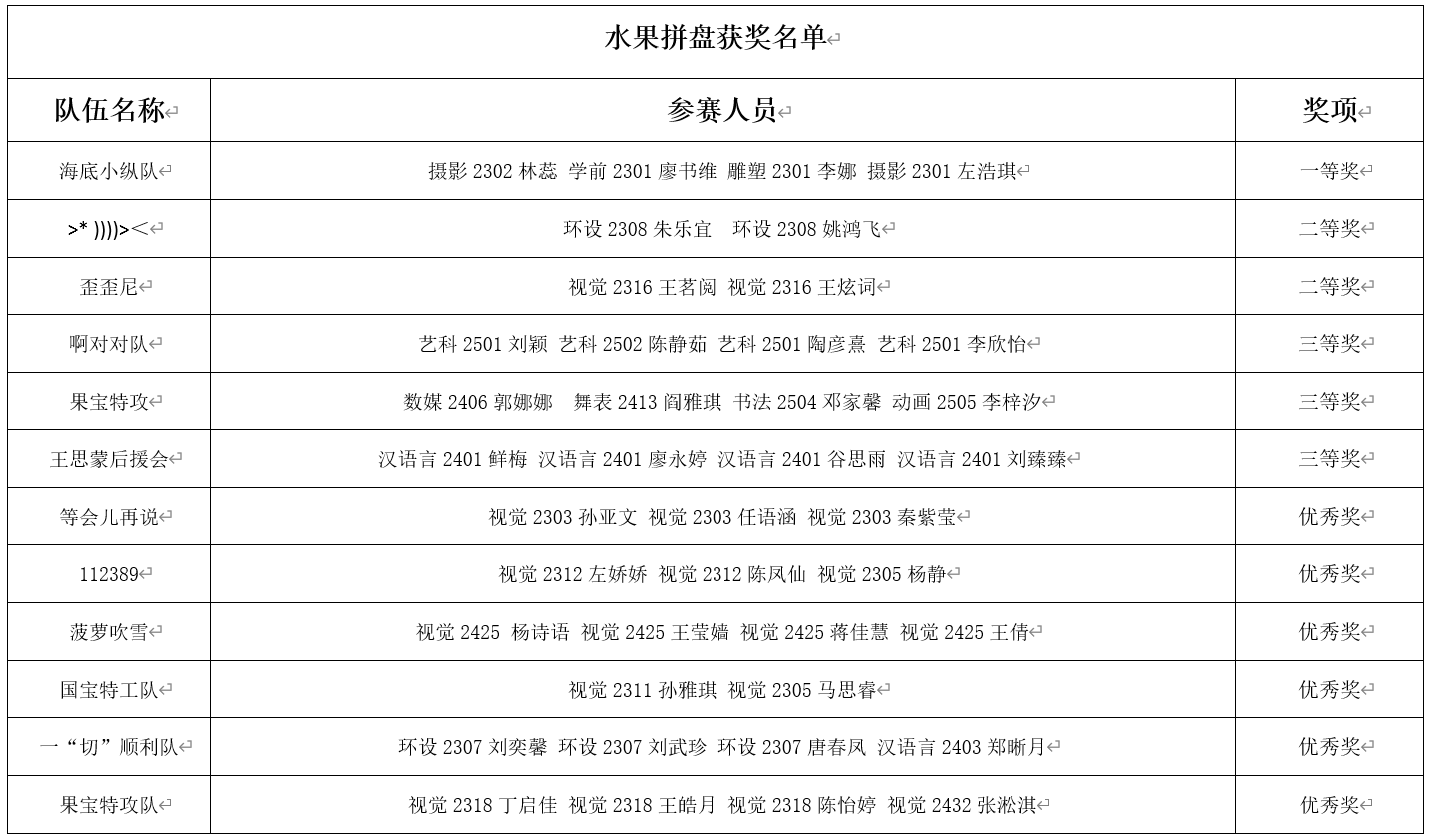 获奖名单